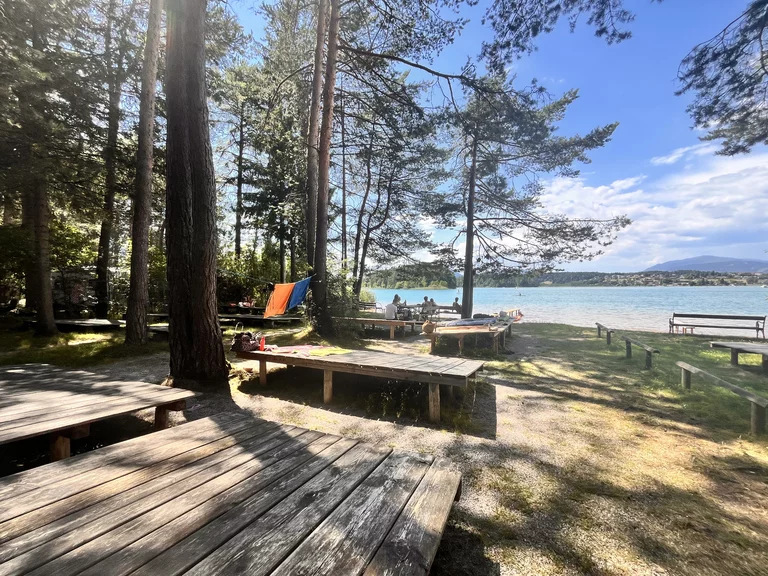 Unser Badestrand am Ostufer (ca. 1 km vom Hof entfernt) des Faaker Sees ist ein Beispiel dafür, dass schöne Dinge einfach so bleiben können. Er ist seit langer Zeit unverändert, es gibt noch Reste des einstigen Waldes, der sich hier bis ans Ufer erstreckt. Sie finden dort Spaß, Erfrischung und Erholung, außerdem schattige Parkplätze für ihre fahrbaren Untersätze, eine große Strandkabine für ihre Boote und Matratzen, selbstredend ein WC und unter knorrigen Föhren hölzerne Liegepritschen in ausreichender Anzahl.